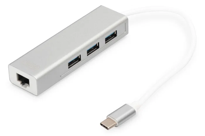 Digitus DA-70255 Hub USB 3.2 Gen 1 Type-C con 3 Puertos USB 3.0 y Puerto Gigabit Ethernet RJ-45, Base/Reproductor para Portátil, Plug & Play, Gris y Blanco