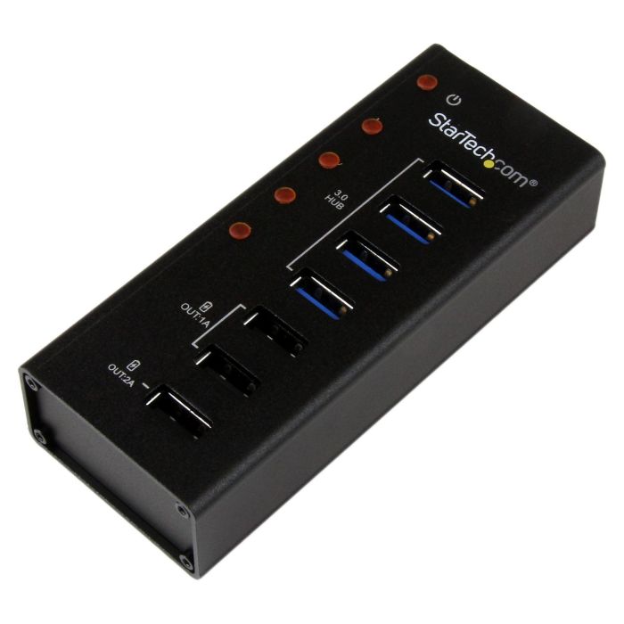 StarTech.com Hub Concentrador USB 3.0 (5Gbps) de 4 Puertos y 3 Puertos de Carga USB ( 2x 1A y 1x 2A) - Ladrón con Carcasa de Metal, USB 3.2 Gen 1 (3.1 Gen 1) Type-B, USB 2.0, USB 3.2 Gen 1 (3.1 Gen 1) Type-A, 5000 Mbit/s, Negro, Aluminio, CC