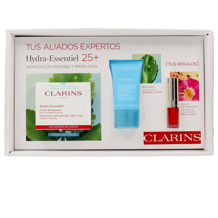 - El set contiene: Clarins Hydra Essentiel Crema Día Pieles Normales a Secas 50 ml + Clarins Mascarilla SOS Hydra 15 ml + Lip Confort Oil Brillo Y Nutrición aceite de labios mini 1.4 ml