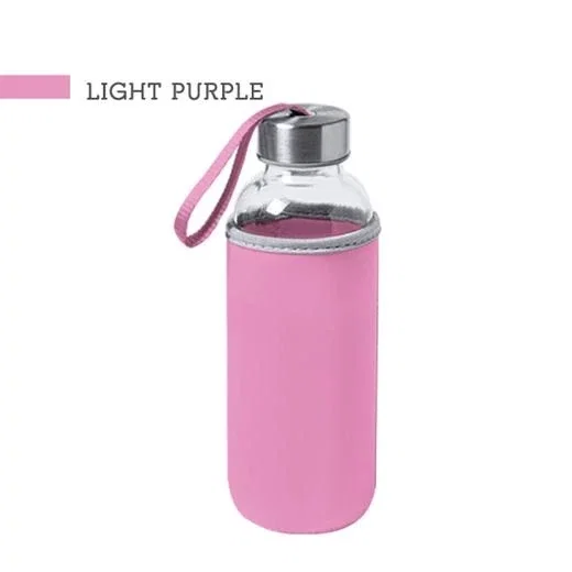 Botella de borosilicato 500 ml Funda Neopreno VIOLETA Botella de vidrio de borosilicato con funda de neopreno y tapa de acero inoxidable, a prueba de fugas. El vidrio de borisilicato es ligero, de alta transparencia , no tóxico, fácil de limpiar, fácil de mantener, y facil de reciclar. Conserva el verdadero sabor de cualquier bebida y resistente a los choques térmicos. Aptas para el lavavajillas. 500 ml de capacidad.