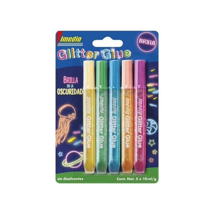 Imedio Pegamento Glitter Glue Brilla en la Oscuridad para Manualidades, 10 ml, Blíster 5 Unidades, Colores Surtidos