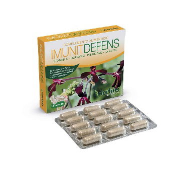 Imunit Defens es un complemento alimenticio en cápsulas con Vitamina C, Pelargonio y Calostro.