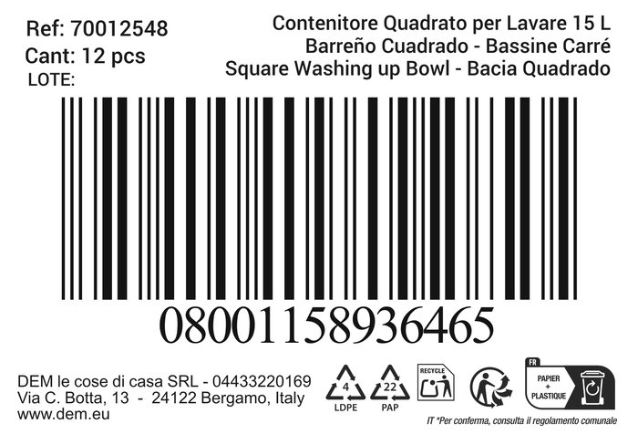 Inde Barreño Cuadrado 15L, para Cocina y Hogar, Dimensiones 47.5 x 34.6 x 16.3 cm (12 Unidades)