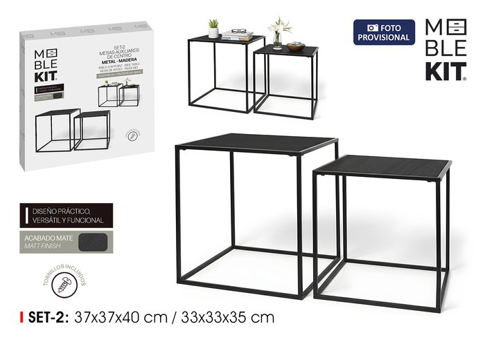 Inde Set de 2 Mesas Auxiliares de Centro en Negro, Medidas 37x37x40 cm y 33x33x35 cm, Moblekit (4 Unidades)