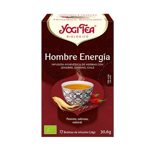 Potente, sabroso, natural. Intenso, pero sin perder su dulzura. Un sabor potente con un final suave. Con un carácter fuerte, pero discreto y auténtico. ¿Ideal del hombre moderno? ¡Para nada! Solo es la descripción de porqué nuestro YOGI TEA® Hombre Energía es irresistible. Gracias a la mezcla de hierbas aromáticas y especias tostadas, ginseng, chile y macis. ¡Una inspiración para el lado masculino que todos tenemos y un auténtico manantial de vigor y energía!