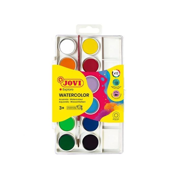 Jovi Acuarelas en Pastillas 22 mm con Pincel, Colores Surtidos, Estuche 12 Unidades