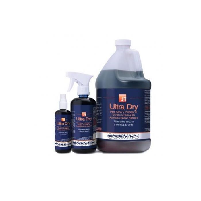 - INSTRUCCIONES DE USO Sumergir y limpiar el cordón umbilical de los animales dentro de los 30 minutos posteriores al nacimiento, cuando el cordón umbilical esté todavía húmedo. Usar una taza de inmersión, llene con JT Ultra Dry la copa de inmersión. Sumerja completamente el cordón umbilical en la solución JT Ultra Dry. Presione la copa de inmersión firmemente contra el abdomen del animal hasta que el cordón umbilical este completamente empapado. Asegúrese de vaciar la copa de inmersión de JT Ultra Dry después de cada uso para evitar la contaminación cruzada en los animales. El cordón umbilical puede sumergirse nuevamente 6 8 horas más tarde para acelerar el proceso de secado si fuera necesario, o en animales nacidos en condiciones o ambientes muy sucios. ESPECIES DE DESTINO Uso en animales en general Vacas, Ovejas, Cabras, Cerdos, Caballos, Perros, Gatos y Mamíferos en general.