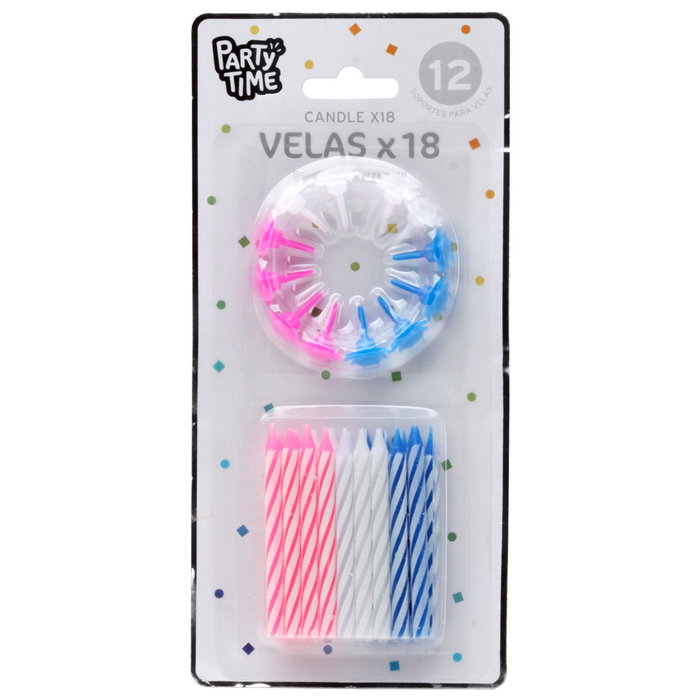 - Velas clásicas con linea blanca en color azul, rosa y blanco con bases de plástico de los mismos colores.