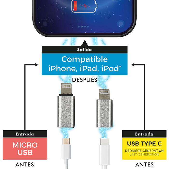 - ¡No es necesario cambiar los cables! Convierta sus cables micro USB o USB tipo C en cables compatibles para iPhone, iPad, iPod.