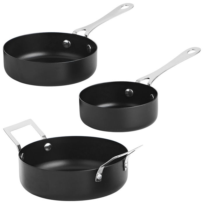- Conjunto de tres sartenes y una olla para servir alimentos.