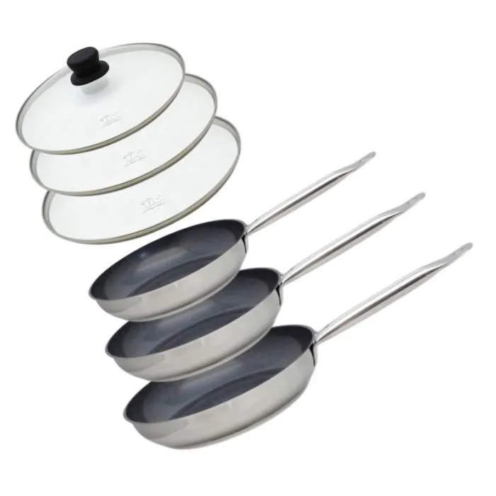 Juego de 3 sartenes de inducción con tapa de cristal - ELO - Profesional - Acero inoxidable 18/10 ELODUR - Ø 24, 28 y 32 cm