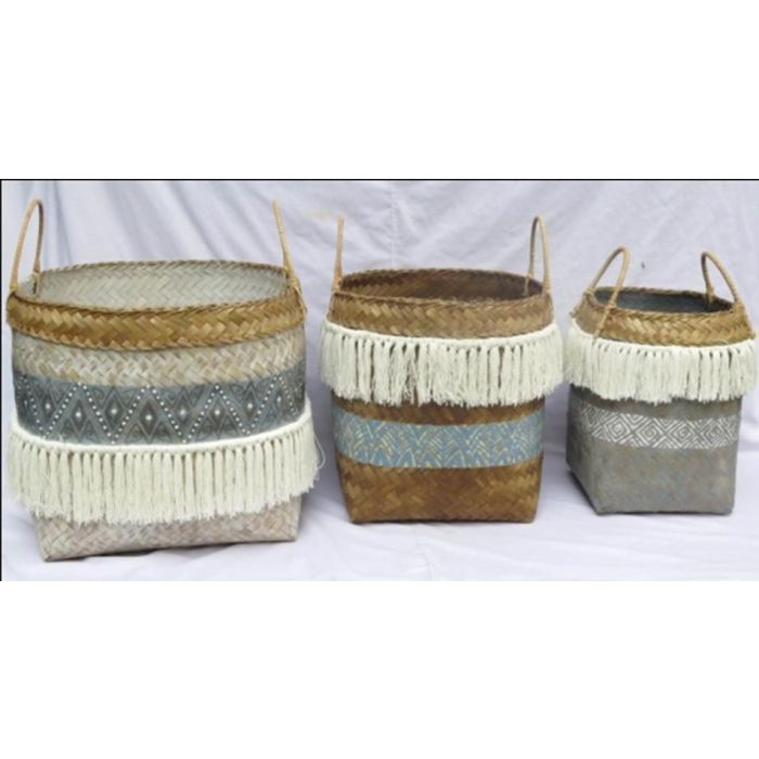 DKD Home Decor Cestas Balines Bambú Algodón Gris Blanco Natural Set de 3 49x57x49 cm