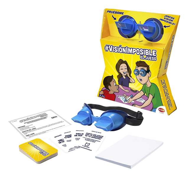 - Contenido caja: 1 par de Gafas Visión Imposible, 1 cuaderno de dibujo, 25 cartas de desafío, 5 cartas Crea tu propio desafío". "