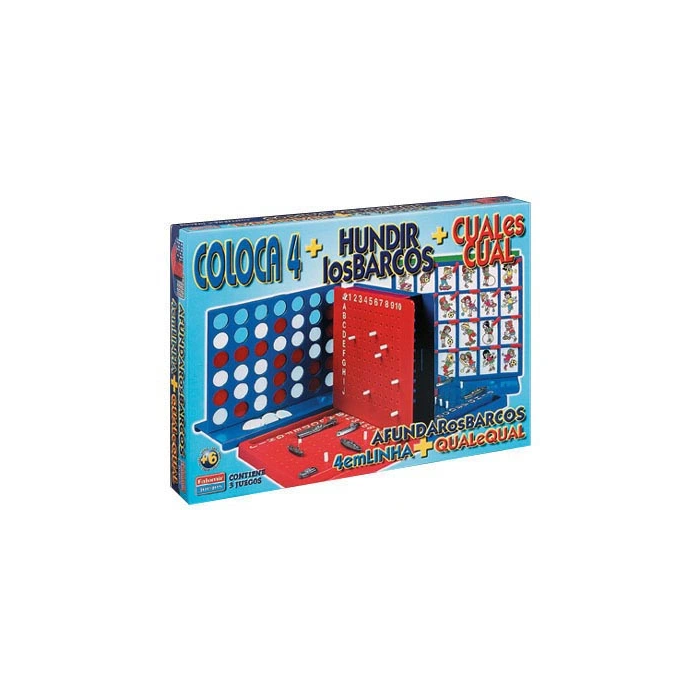 - Contenido caja: Coloca 4: Base + rejilla, Fichas rojas y blancas. Cual es Cual: Rejilla + base, Señalizadores rojos , 2 Laminas con 24 personajes. Hundir los Barcos: Caja plástico rojo/azul, Barcos, Pivotes rojos/blancos