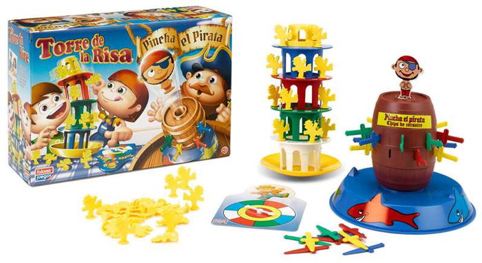 - Contenido caja: Pincha el Pirata: 1 base, 1 barril, 1 pirata, 24 espadas, adhesivos. Torre de la risa: Torre de la risa (5 pisos) , Ruleta + Fichas payasos