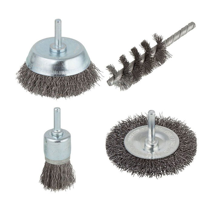 Juego de cepillos, vástago redondo ø6 mm, compuesta de: cepillo de disco ø75 x 10 mm, cepillo de copa ø75 mm, cepillo cilindrico ø28 x 60 x 90 mm, cepillo pincel ø25 mm