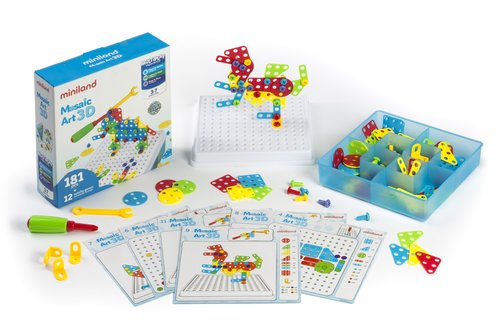 Con Mosaic Art se construye en 2 y en 3 dimensiones sobre un resistente soporte de montaje, que a su vez es la tapa del contenedor donde se guarda todo el contenido. Contiene: 181 piezas con herramientas y 12 actividades de juego. Edad: 3-7 años.