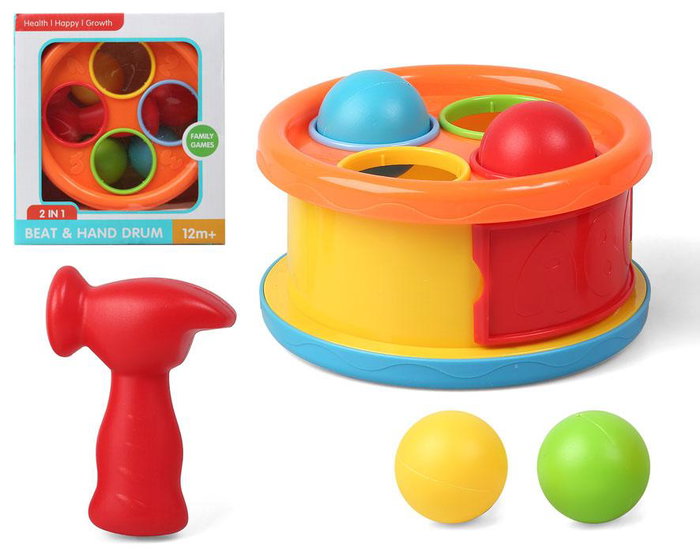 Gran juego para los más pequeños de la casa. así podrán descubrir el mundo y como funciona. este kit se compone de un tambor, cuatro bolas de colores y un martillo. el tambor mide aproximadamente 20*18*18 centímetros. el pequeño deberá introducir dentro del tambor y con la ayuda del martillo las bolas de colores. todo un desafía para su corta edad. recomendado para bebés a partir de 12 meses.