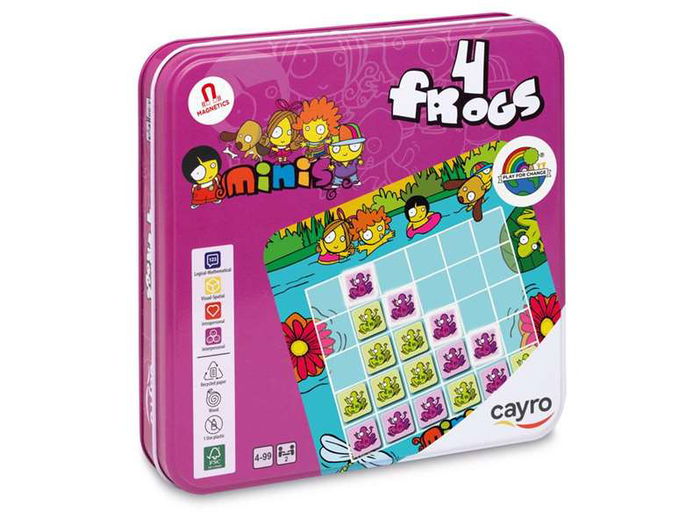 Juego 4 en líena Frogs de madera en caja de metal. 8 piezas, 2 jugadores. 19x19x3,5cm