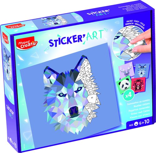 Juego Maped creativo sticker Art. Pega las pegatinas siguiendo los números y descubrirás bonitos retratos de animales de origami. Contiene: 4 láminas impresas de 20 x 20 cm y 5 hojas de pegatinas.