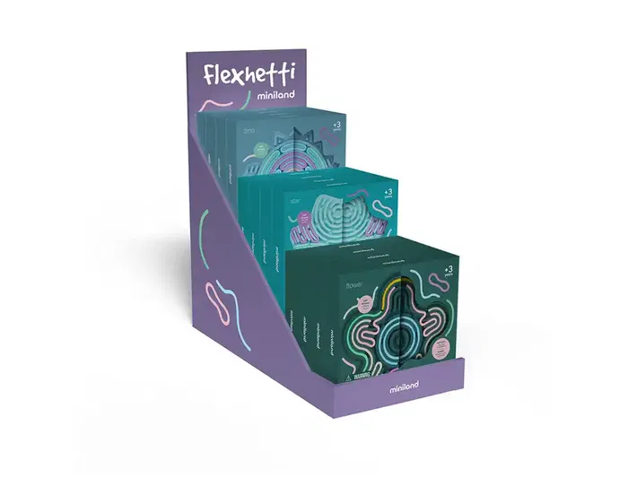 Miniland Juego Educativo Flexihetti Expositor 12 Unidades Surtidas, Silicona Segura, Coordina y Concentra +18 Meses