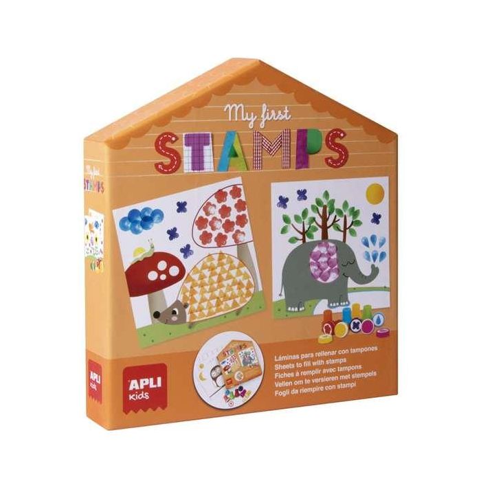 - Contenido caja: 6 láminas con diseños diferentes, 10 tampones con diferentes formas y colores y 1 libro con instrucciones y ejemplos