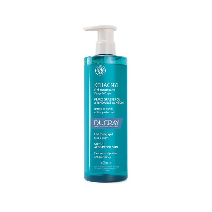 Descubre KERACNYL gel limpiador de DUCRAY, un innovador producto de 400 ml diseñado para la limpieza facial y corporal de uso diario. Especialmente formulado para pieles grasas o con tendencia acneica en adolescentes y adultos, este gel es apto para preadolescentes a partir de los 9 años.