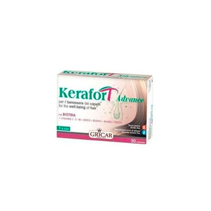 Indicaciones: Kerafort Advance de Gricar es un complemento alimenticio a base de minerales, vitaminas y extractos de plantas que dan apoyo al normal mantenimiento del cabello: La biotina contribuye a mantener el cabello en condiciones normales. El Zinc, la Vitamina E Y C, el Selenio ayudan a la protección de las células frente a la oxidación. La Vitamina B5 participa en la producción de energía celular. Producto sin gluten.