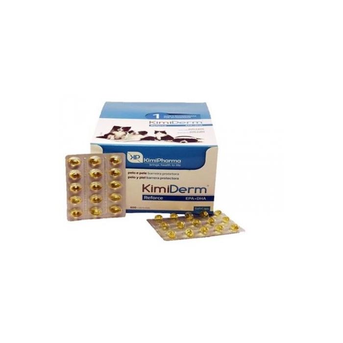 - Indicaciones: Apoyar la función dérmica en caso de dermatosis y alopecia Modo de empleo: Administrar una vez al día (directamente en la boca o mezclado con la dieta) de acuerdo con el peso corporal: < 10 Kg 1 Cápsula KimiDerm ® 10 - 20 kg 2 Cápsula KimiDerm® 20 - 30 Kg 3 Cápsula KimiDerm® 30 - 40 Kg 4 Cápsulas KimiDerm® > 40 Kg 5 Cápsula KimiDerm® Con el fin de obtener resultados de prevención, KimiDerm® Ref orce debe utilizarse de forma continua durante un período de 1 a 2 meses. La administración debe repetirse dos veces al año, preferentemente durante el periodo de primavera y otoño (periodos anteriores a la caída estacional de la capa). Para la reso l ución de los signos clínicos, la dosis puede aumentarse para el doble (una toma por la mañana y otra por la noche) con excepción para los animales que pesan menos de 3kg.
