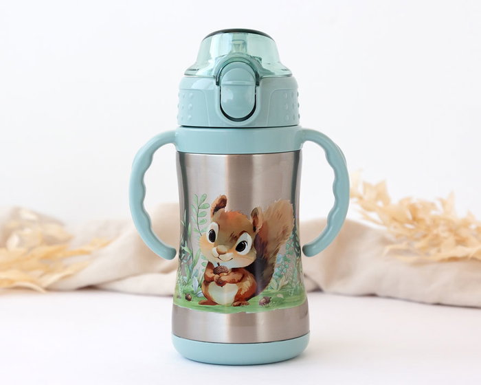 ¿cómo es esta botella? fácil de coger por sus dos asas hechas a la medida de los más pequeños, ligera y segura para que no se derrame el líquido y puedan beber tranquilos. está fabricada en acero inoxidable 304, por lo que es muy resistente a golpes y caídas. además, mantiene el calor 10h y el frío 12h, ya que actúa como un termo. si quieres eliminar los plásticos en contacto con alimentos, el acero inoxidable es una opción perfecta ya que es muy fácil de limpiar, y no libera toxinas como el bpa. su apertura se acciona con un sencillo mecanismo de botón y se abre el tapón que la mantiene limpia y hace que sea más segura para cuando beba tu bebé. también tiene incorporado una pajita en silicona para que le sea más fácil aprender a beber y a sorber. - está recomendado para niños de +6 meses. - lavar con agua tibia y jabón antes y después de cada uso. - capacidad: 280 ml. - almacenar abierto en un lugar limpio y seco. - no apto para lavavajillas. - no apto para microondas. - no aproximar a fuentes de calor.