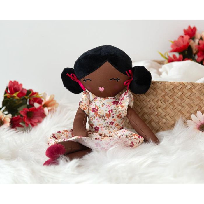 KioKids Muñeca de Trapo Morena con Vestido de Flores y Lacitos Rosas, 100% Poliéster, +10 Meses