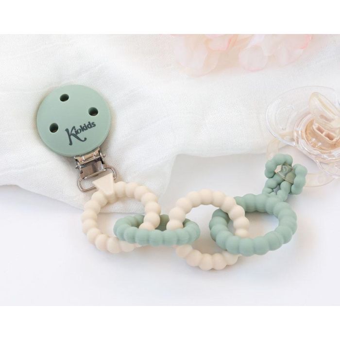 KioKids Sujetachupetes de Silicona Anillado Salvia +0 Meses, Textura Suave y Segura, Pinza Acero Inoxidable