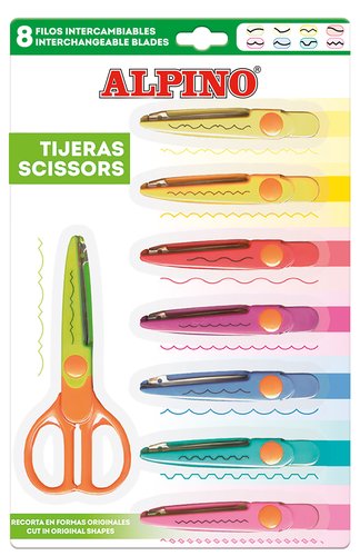 Las tijeras más divertidas. Contiene 8 recambios para 8 diferentes tipos de corte para crear divertidos trabajos manuales. Tijera + 8 cuchillas de diferentes cortes.