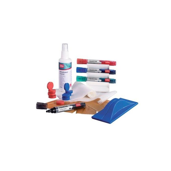 Kit Pizarra Blanca Nobo Completo (4 Marcadores, Borrador, Recambios De Borrador, Trapos Microfibra, 10 Imanes Y Spray 125 Ml)