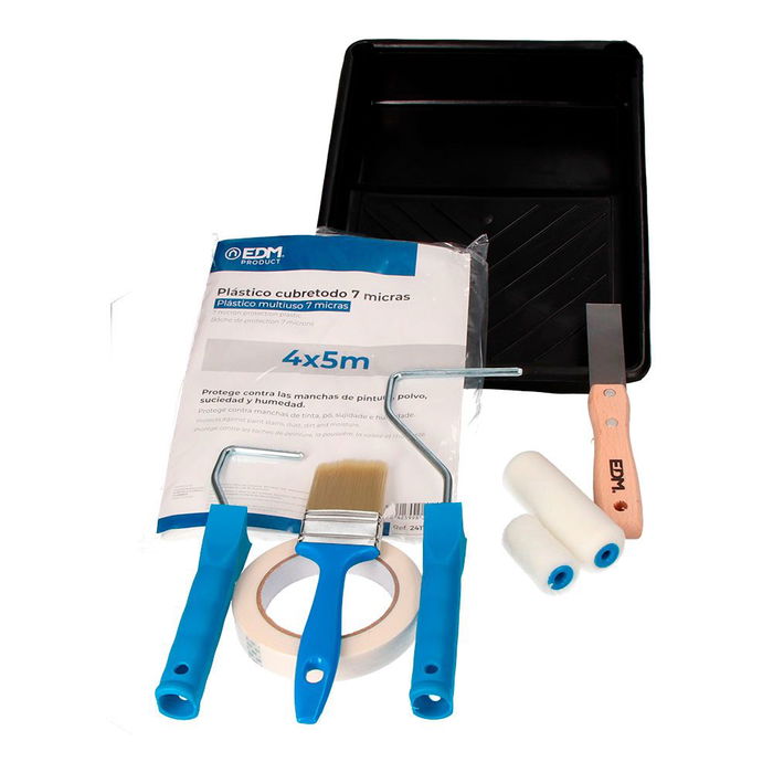 Edm Kit para pintar 8 piezas con rodillo esponja 10 cm, recambio mini rodillo 5 cm lana, varilla mini 5 cm, paletina, espatula, cubretodo, cinta pintor y cubeta
