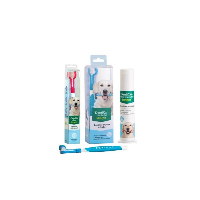 - COMPOSICION Pasta: Agua, Glicerina, S¡lica hidratada, Pirofosfato tetrapotásico, Sorbitol, Pirofosfato tetrasódico, Goma xantana, Bióxido de titanio, Triclosán, Sacarina sódica, Aroma vainilla, Metilparabén sódico, EDTA disódico, Kaol¡n. INDICACIONES El cepillo dental Difresh dispone de un triple cabezal flexible, cómodo y eficaz. Gracias a su forma diseñada especialmente para los dientes caninos, facilita la limpieza con total seguridad de todos los rincones de la boca del perro. La Pasta dental Dentican es un dent¡frico especialmente diseñado para las mascotas, que elimina el mal aliento, combate la placa bacteriana y controla el sarro. Prersentación: Pasta en tubo de 100 g.