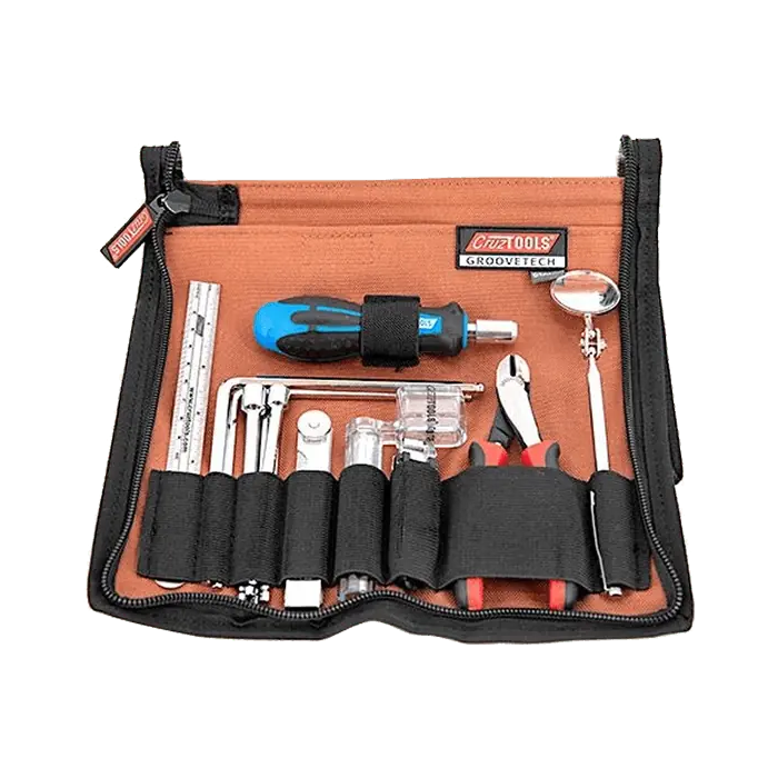 El GrooveTech Acoustic Guitar Tech Kit es el kit ideal para mantener su acústica en las mejores condiciones de trabajo. El kit técnico para guitarra acústica tiene un destornillador con bloqueo que permite un rápido intercambio de puntas, con puntas especiales para el ajuste de la boca y de la varilla del clavijero. También se incluyen elementos básicos del kit técnico, como un medidor de alturas y una cejilla para medir el relieve, puntas de destornillador, una manivela de cuerdas, nuestros alicates de corte GrooveTech y un espejo telescópico en caso de que necesite echar un vistazo al interior del cuerpo. Nuestra Guía de Configuración Fácil le guía a través del proceso de configuración básica para mantener su guitarra en la mejor forma.