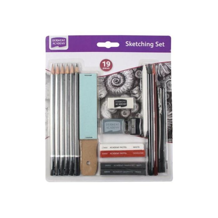 Lapices Derwent Academy Kit De Bocetos 19 Piezas 6 Lapices De Grafito 2 Barras De Grafito 2 Lapices De Dibujo + 1 Goma + 1 Goma Amasable 2 Pasteles + 2 Carboncillo 1 Papel Lija + Sacapuntas + Difumino