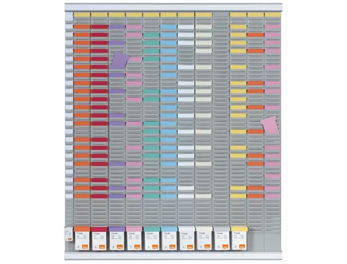 Kit de planificación anual con fichas T de Nobo. Este kit de planificación incluye todo lo necesario para implantar una planificación anual efectiva, duradera y a gran escala. Contiene 12 x paneles de 54 ranuras tamaño 2, 1 x panel índice de 54 ranuras tamaño 1, 2 guías de aluminio con tiras de encabezamiento en blanco, 10 cajas de 100 fichas T de tamaño 2 en colores surtidos, una caja de 100 fichas T blancas de tamaño 1 y etiquetas impresas con los meses del año más portaetiquetas magnéticos.