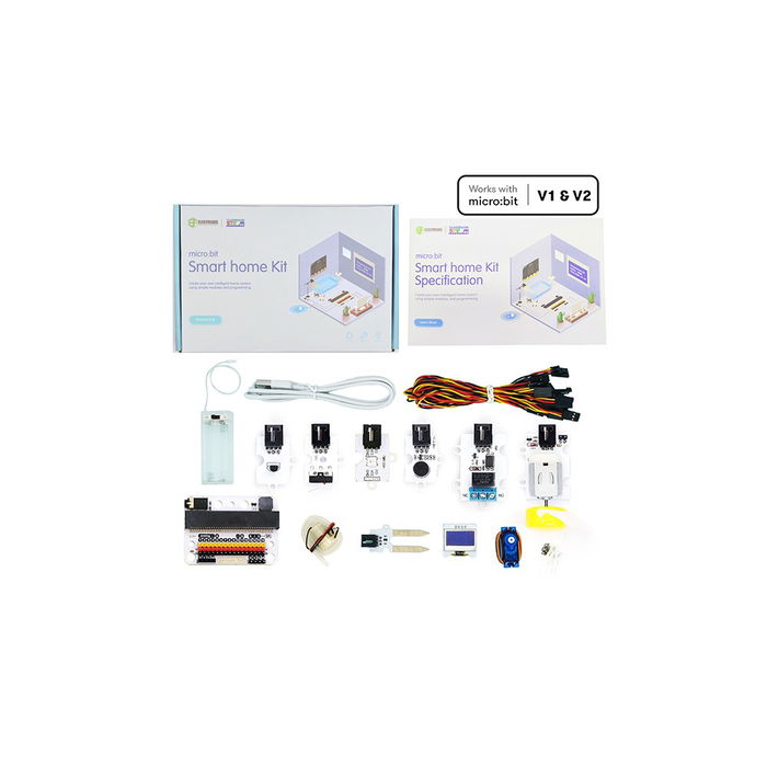 El kit de casa inteligente con micro:bit contiene componentes que se usan com�nmente en el hogar como sensor de temperatura, sensor de sonido, sensor de choque, servo, motor, o LED de arco iris,