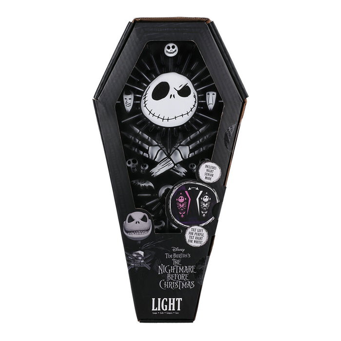 Nightmare Before Christmas Coffin 3D Light. Se puede exhibir sobre una mesa sin nesecidad de una base. Con 2 distintos modos de luz entre blanco y fucsia deslizando la tapa del ataúd a derecha o