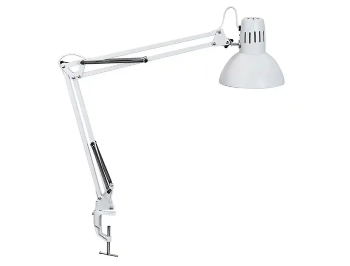 Lámpara de escritorio MAUL. Fabricada en metal. Potencia de 57W. Diseño funcional con doble brazo y cabezal giratorios, con 2 articulaciones que permiten ajustar el ángulo de iluminación con precisión. Incluye pinza para mayor sujeción. Conexión mediante enchufe convencional. Longitud del cable 1.800 mm. Medidas 595x170x440 mm. Peso 810 gramos. Color blanco.