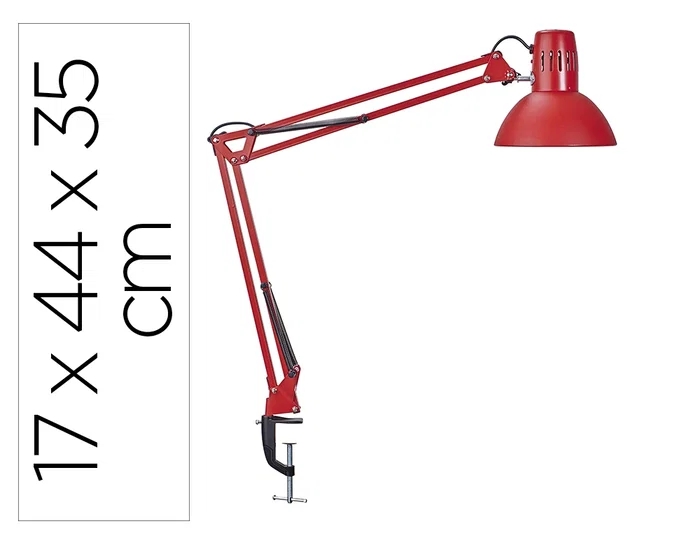 Lámpara de escritorio MAUL. Fabricada en metal. Potencia de 57W. Diseño con doble brazo giratorio, pinza de sujeción y cabezal orientable. Conexión mediante enchufe convencional. Longitud del cable 1.800 mm. Medidas: 595x170x440 mm. Peso: 810 gramos. Color rojo.
