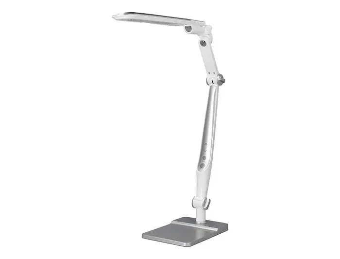 Lámpara de escritorio Q-Connect. Fabricada en ABS. Potencia de 9W, 32 LEDsy un flujo luminoso de 550 lúmenes. Temperatura de Color: (CCT) ajustable : 3000K (luz cálida), 4300K (luz neutra) y 6300K (luz fría), con un índicede reproducción cromática (CRI) de 80 para una iluminación precisa. Senso r táctil para encendido/apagado y cambio de Color:. Brazo y base oscilantes con 3 articulaciones que permiten orientar la luz con precisión. Vida útil estimada de 20.000 horas. Cable de 130 mm. Certificados CE y RoHS. Medidas: 350x511x358 mm. Peso: 1.400 gramos. Color: plateado.