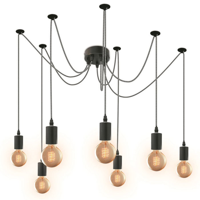 - Con cable tejido blanco y negro, 4 cables de 2,5 m y 3 cables de 1,8 m Para 7 bombillas E27 max.40 W (no incluidas).