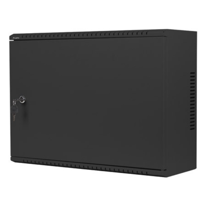 Fabricado en acero con acabado en color negro. Cuenta con puerta delantera metálica con cerradura y bloqueo de teclado, asegurando la protección del equipo. Incluye rieles de rack y ofrece un ángulo de apertura de puerta de 220° para facilitar el acceso.