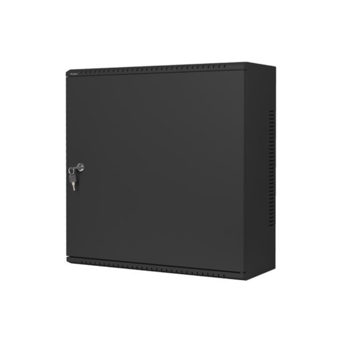 Diseñado en color negro, con puerta delantera metálica equipada con cerradura y ángulo de apertura de 220°. Cuenta con bloqueo de teclado para mayor seguridad y rieles de rack que facilitan la instalación de equipos. Protección IP20 contra el polvo en ambientes interiores.