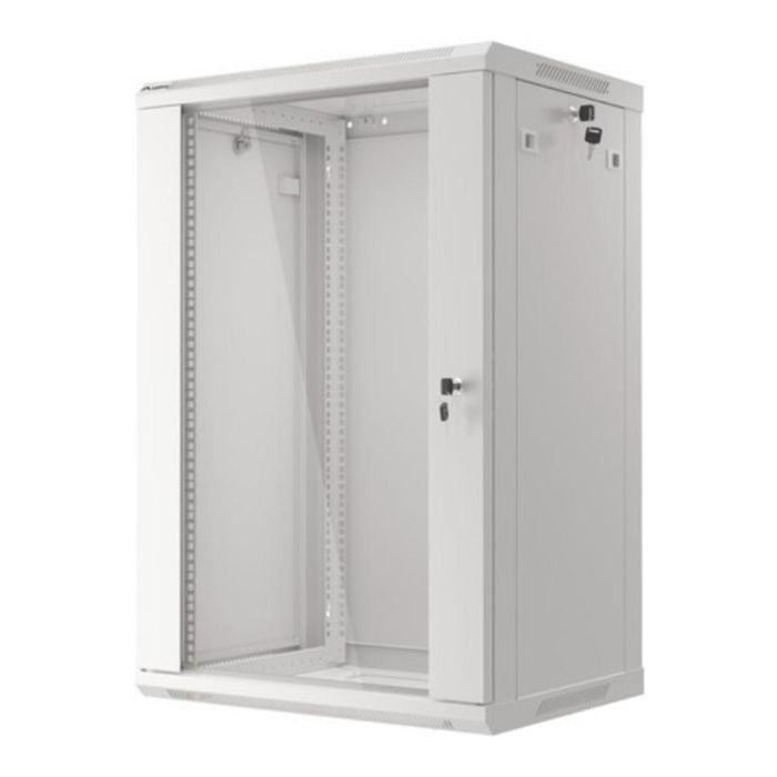 Bastidor de pared de 19 pulgadas (48,3 cm) con capacidad de 18U. Diseñado para instalaciones profesionales de red y telecomunicaciones, soporta una carga máxima de 60 kg.