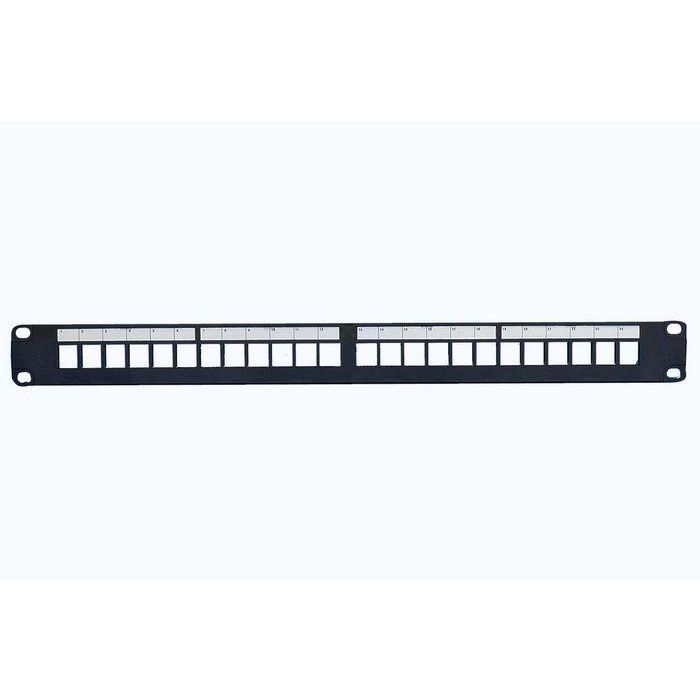 El panel cuenta con un campo de etiquetado serigrafiado ubicado sobre cada puerto, y puentes para bridas de cables están posicionados detrás de cada puerto para aliviar la tensión del cable.