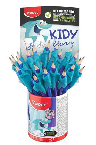 Bote de 22 lápices con guía para los dedos en forma de aleta de tiburón. Un diseño ergonómico que ayuda a los más pequeños a posicionar los dedos sin superponerlos. Además, el tope al final de la cabeza de tiburón se posiciona a la distancia ideal de la mina del lápiz. Un producto para diestros y zurdos recomendado por profesores. Ideal para alumnado de entre 3 y 8 años.